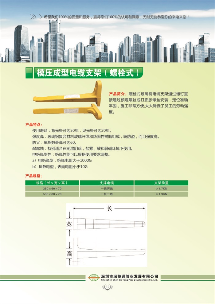 螺栓式玻璃鋼電纜支架通過螺釘直接通過預埋螺絲或打膨脹螺絲安裝,定位準確牢固,施工非常方便,大大降低了員工的勞動強度