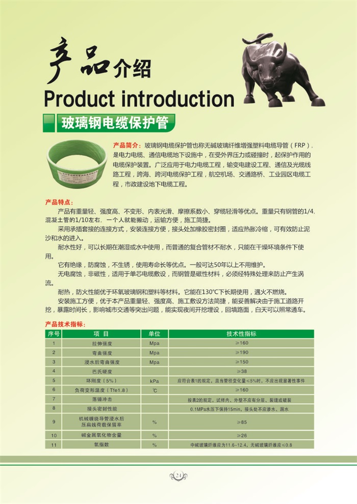 玻璃鋼電纜保護管也稱無堿纖維強強塑料電導管(FRP),是電力電纜、通信電纜地下設施中,在受外界壓力或碰撞時,起保護作用的電纜保護裝置。廣泛應用于電力電纜工程,輸變電建設工程、通信及光纜線路工程,跨海、跨河電纜保護工程,航空機場、交通路橋、工業園區電纜工程,市政建設地下電纜工程。