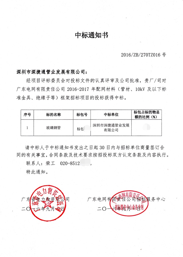 熱烈祝賀深捷通管業成為廣東電網2016-2017年度玻璃鋼管中標單位!